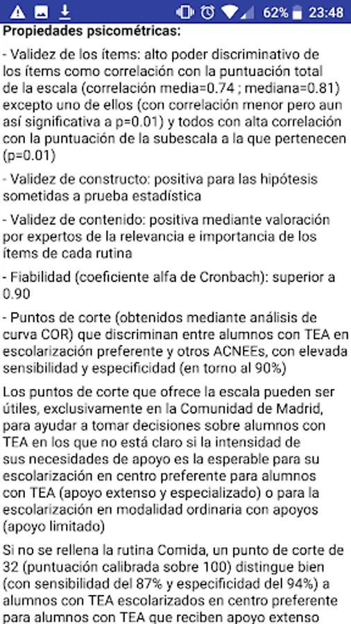 The scale is put to the test in a pilot study with a sample of students with special educational needs in the Community of Madrid. The psychometric values of the scale are indicated in it.