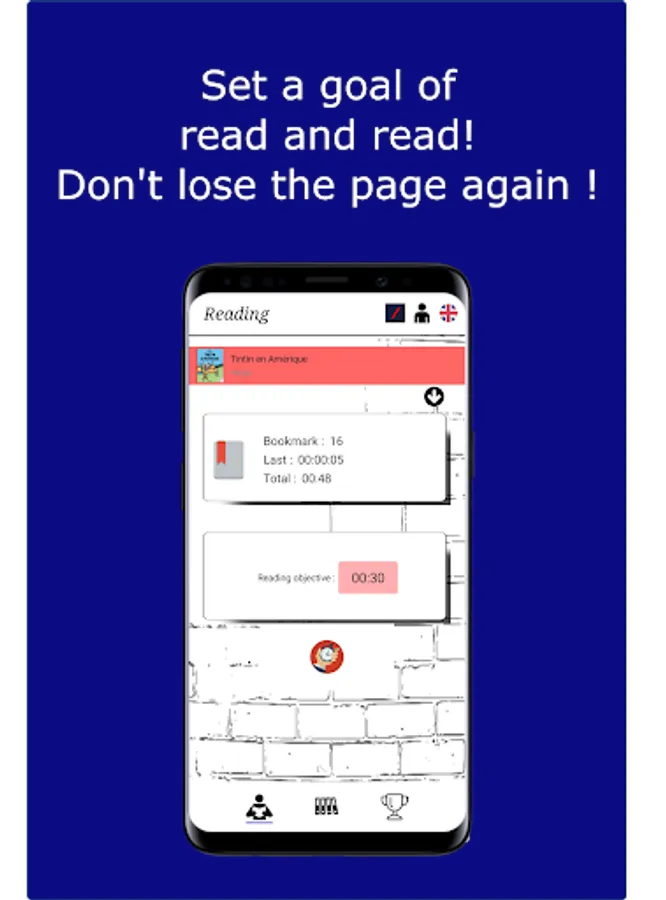 To get started, just choose a book from the library, set the timer and start reading! The timer counts down the time then a vibration signals that the duration has been reached but nothing prevents you from continuing! After entering the page number of the current book: the bookmark is set.