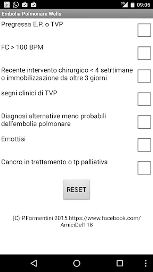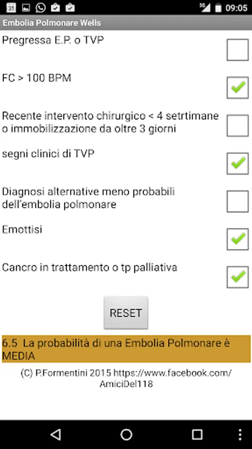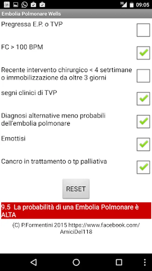 calculation of the risk of pulmonary embolism according to the criteria of wells