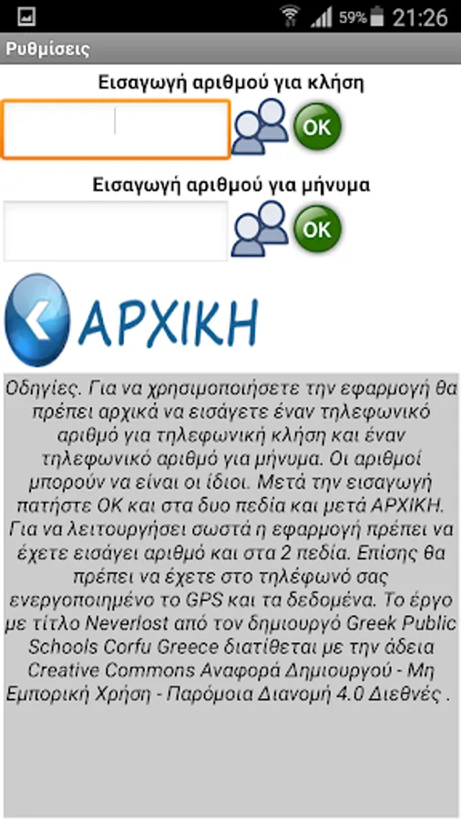 An application that was designed and implemented by middle school students, high school and EPAL the D.D.E. Corfu. The purpose of this application is to help children to call for help their parents. The application was designed with simplicity in mind to use the application mainly by children with special needs that are in emergency condition. The user using the application can be called using a button a phone (the parent's) to send a text message to another phone, to see the place on the map, send its location to a text message or send the map position to another mobile phone. The project entitled Neverlost from the creator Greek Public Schools Corfu Greece is licensed Creative Commons Attribution Creator - NonCommercial - ShareAlike 4.0 International.