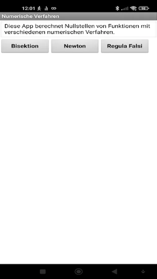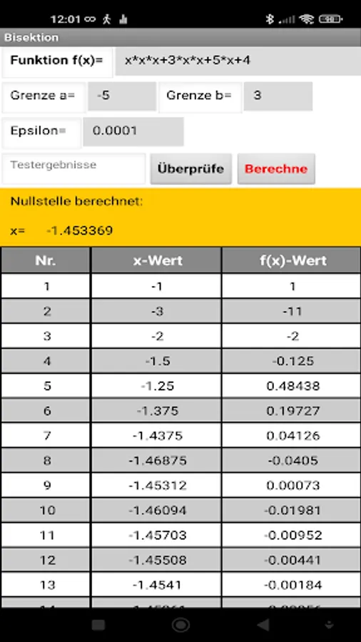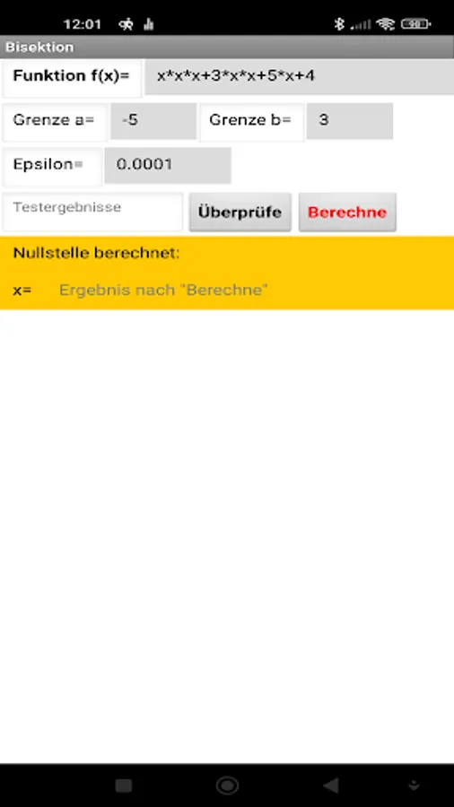 After entering the function and the starting values, a zero is calculated to a certain accuracy.