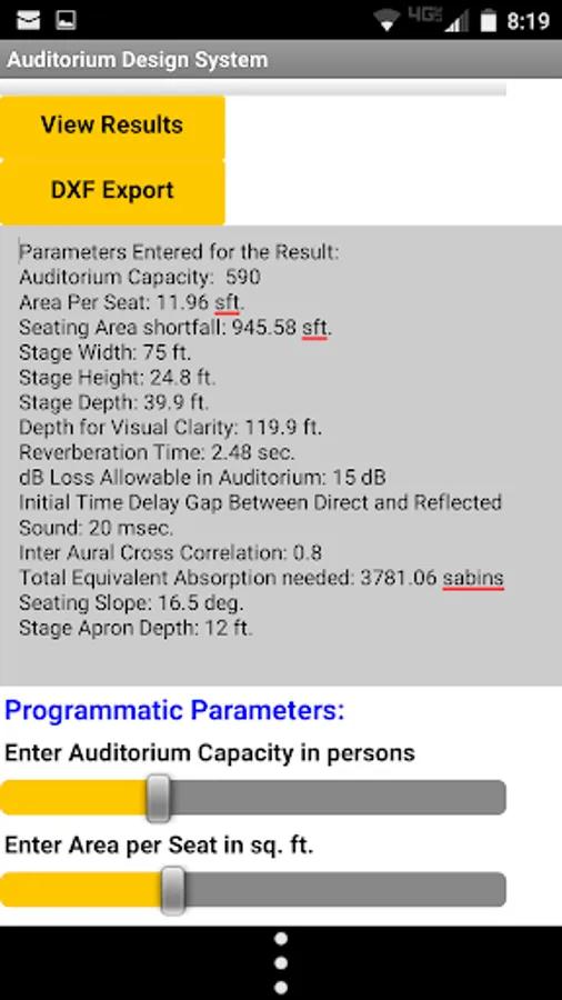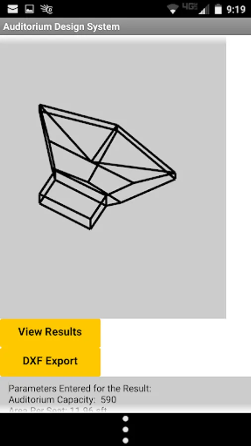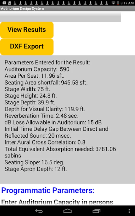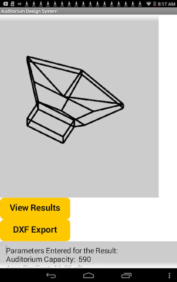 After updating parameters using the sliders the View Results button must be clicked to update the design solution. This will also update the screen where the data entered is displayed. The current solution (established by a View Results click) is the one used for the DXF export.
