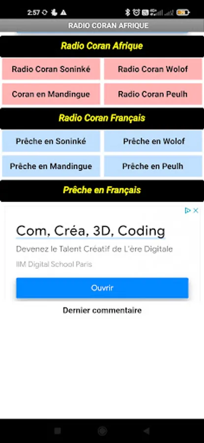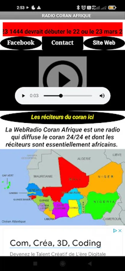 The WebRadio Quran Africa is a radio station that broadcasts the Quran 24 hours a day and whose reciters are mainly African. The application also includes other radios that translate the Quran into the following languages: