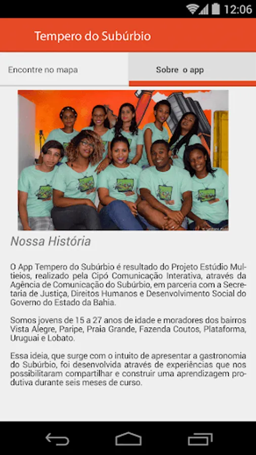 The App Tempero of Suburbia is a result of the Multimedia Studio Project, conducted by Cipo Interactive Communication, through the suburb Communications Agency, in partnership with the Department of Justice, Human Rights and Social Development of the State of Bahia. The Cipó Interactive Communication is a non-profit NGO, independent, which operates in Salvador transforming the lives of girls and boys working classes through communication.