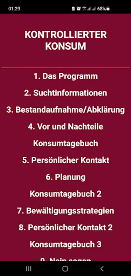 With the help of the app created by Verein Pass, you have the opportunity to work on your substance consumption. With the 12-step program you can get your consumption under control online and face-to-face free of charge. You will receive addiction information, clarification and education. The structured program lets you reflect on and work on your behavior. You keep a diary and set goals and plans. You will learn coping strategies and dealing with relapses.