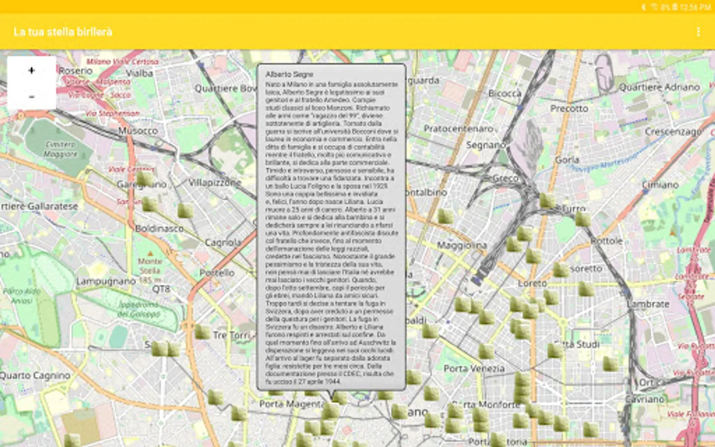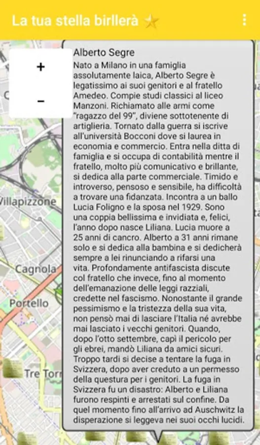 The application allows you to geolocate yourself on a map on which the Stumbling Stones of Milan are located. By clicking on the individual icons of the Stones you can read the story of the person to whom they are dedicated. The purpose of the application is to make accessible to everyone, even the youngest, the possibility of remembering the victims of the Holocaust by making the "star" of each of those people shine, inspired by the phrase of Liliana Segre. And as Gunter Demnig, the creator of the Stumbling Stones, says: "a person is forgotten when his name is forgotten". But the application wants to go further, and also make its history remembered.