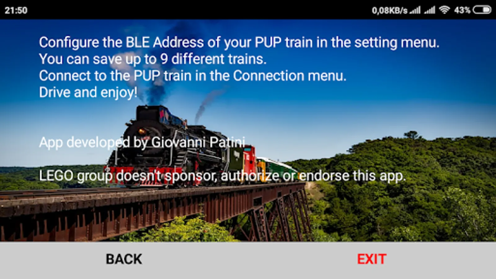 PUP D-One allows you to control your Lego Powered-Up train (both A and B ports) using your Android device (smartphone or tablet).