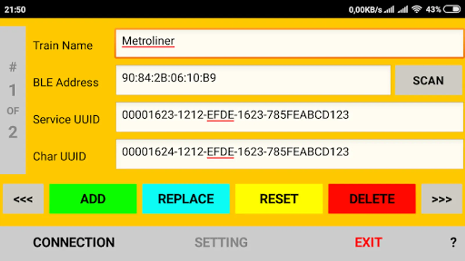 - in the "setting" menu tap on the SCAN button. The app will identify the Bluetooth Address of the train. Save it and rename the train if you want.