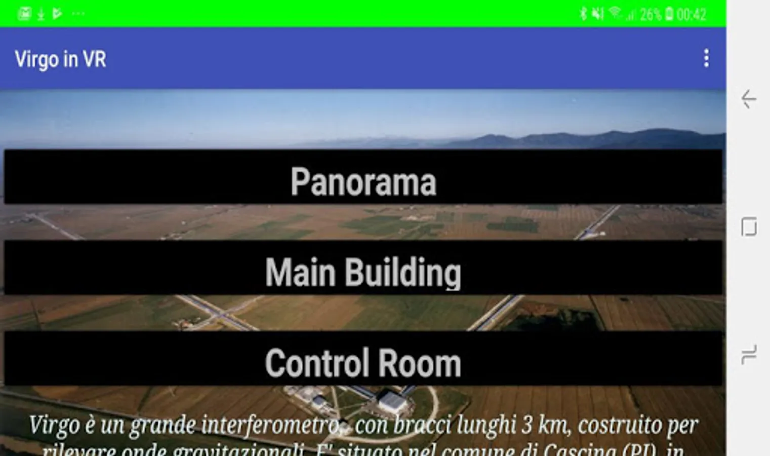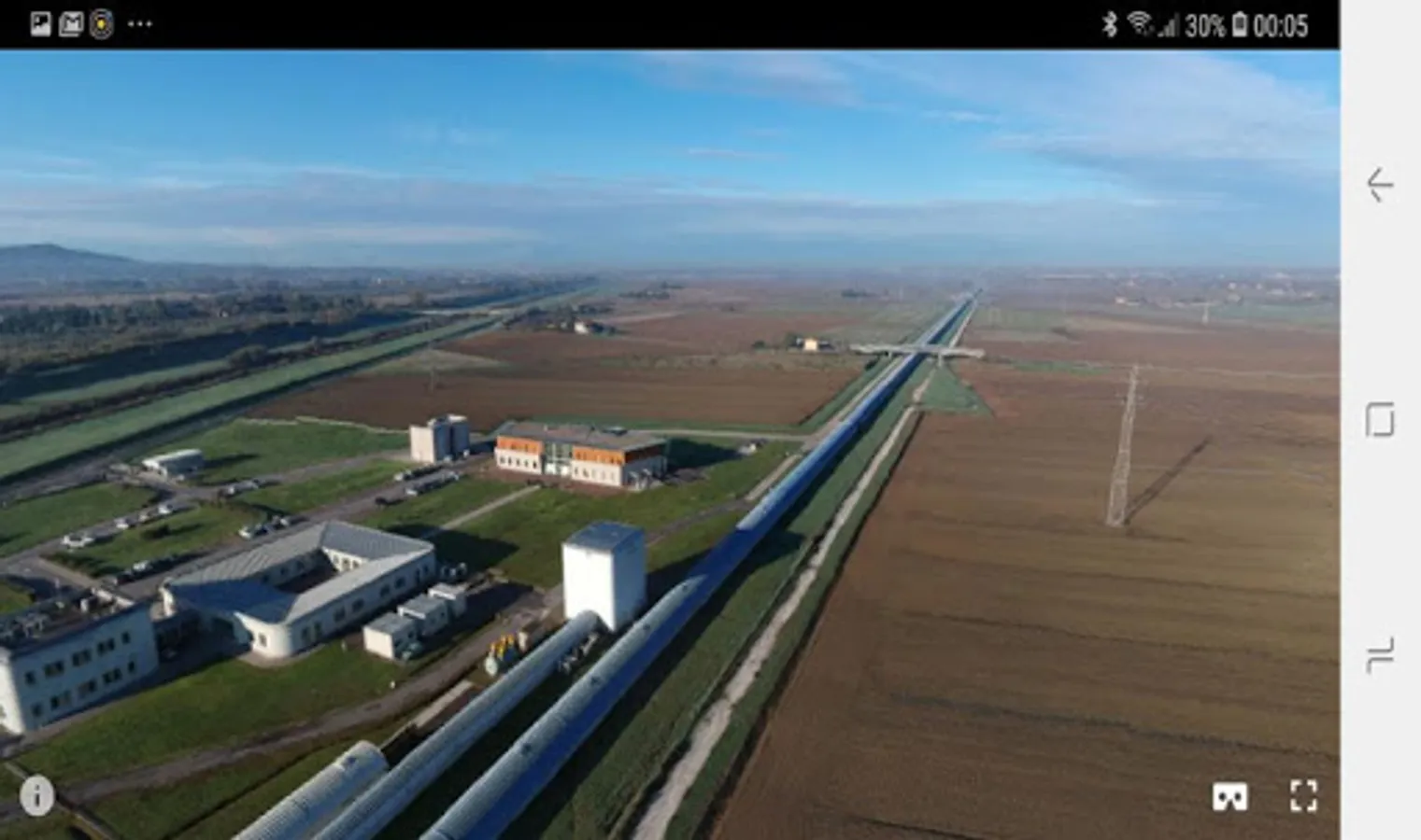 Three images of the Virgo interferometer are shown. Virgo is a large interferometer built to detect gravitational waves from the universe; gravitational waves are an effect predicted by Einstein's general theory of relativity. Virgo is a Michelson interferometer, with 3 km long arms, located in the town of Cascina (PI), in the Santo Stefano area of Macerata.