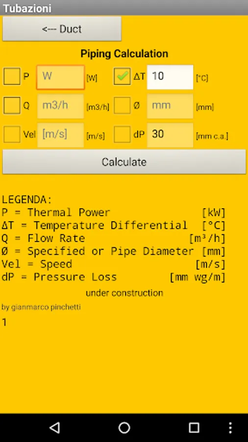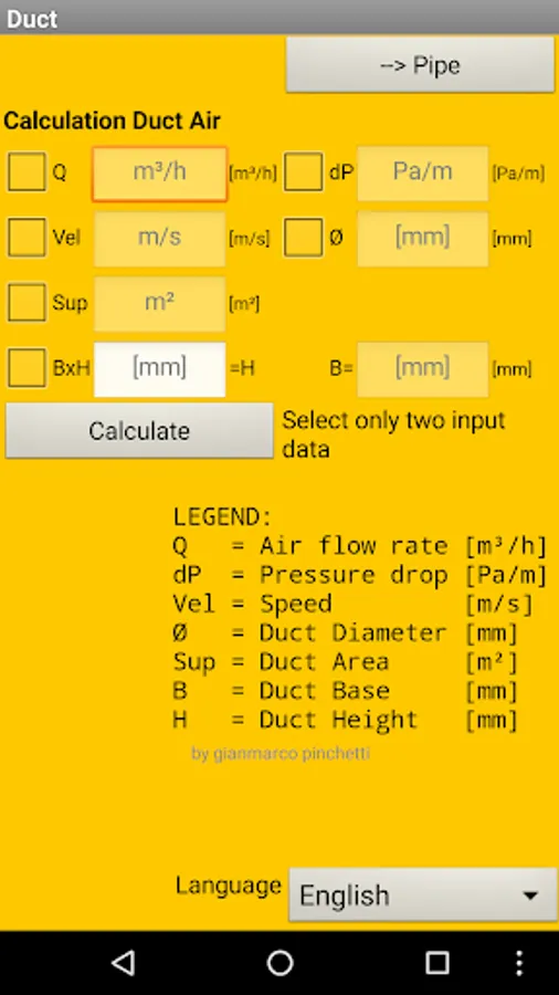 The application calculates air ducts for air conditioning and the calculation of hydronic piping.