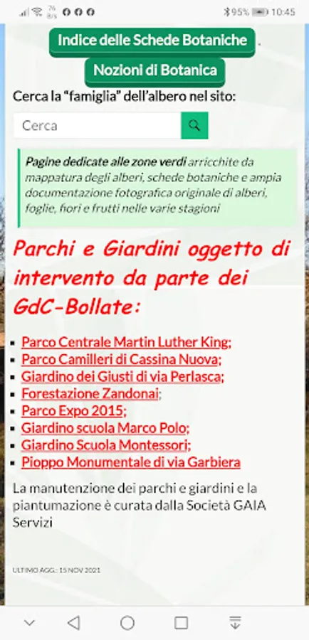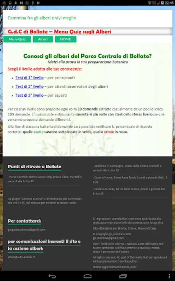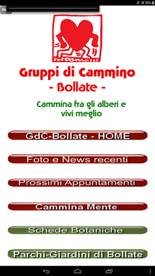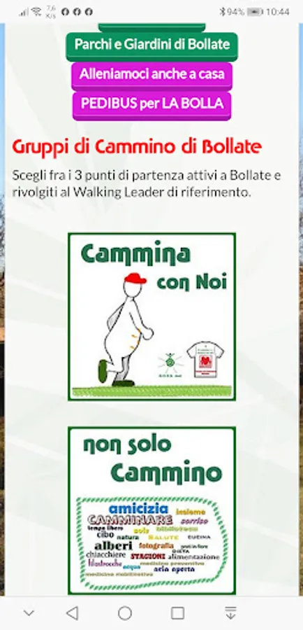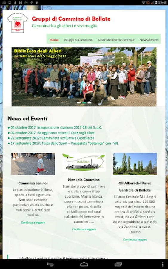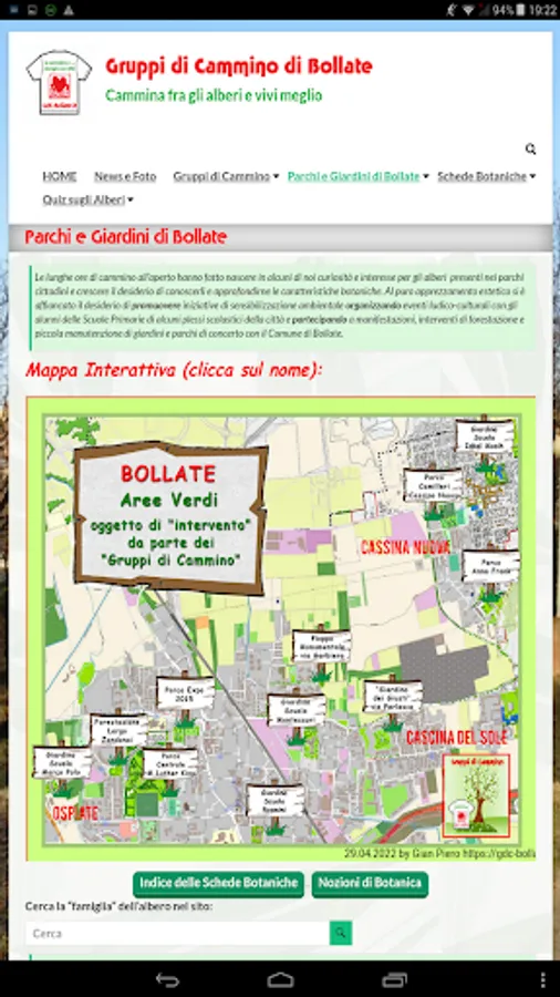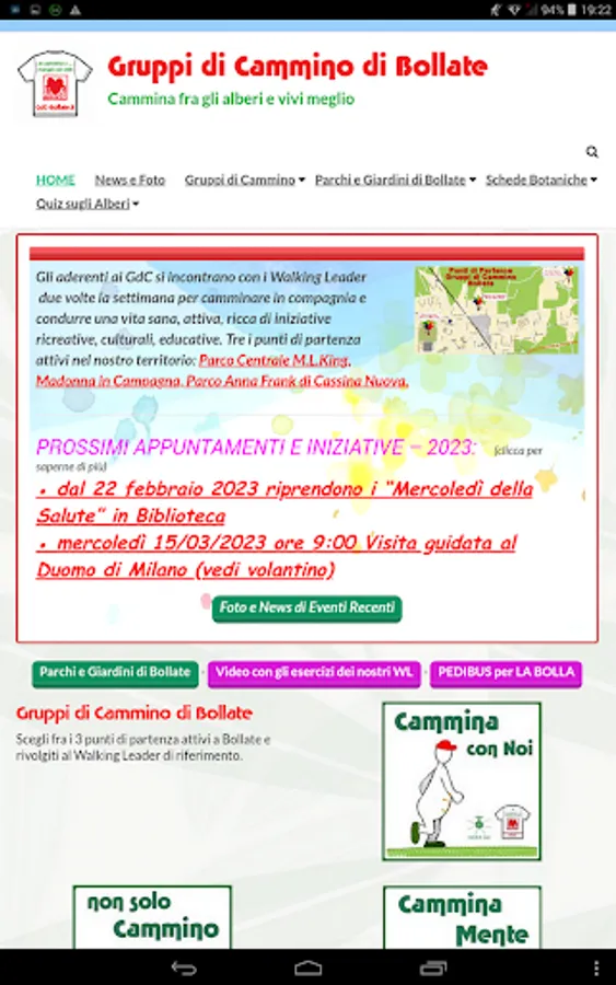The app was created to facilitate navigation on the Cammino di Bollate Groups website and easily access the related news, cultural or social initiatives in progress and those already implemented year after year, accompanied by extensive photographic documentation. On the site, considering that you walk in the company and in contact with Nature, there is also a large section dedicated to the trees and shrubs present in the school parks and gardens of Bollate, accompanied by more than 140 simplified botanical cards (new button) and extensive photo gallery.