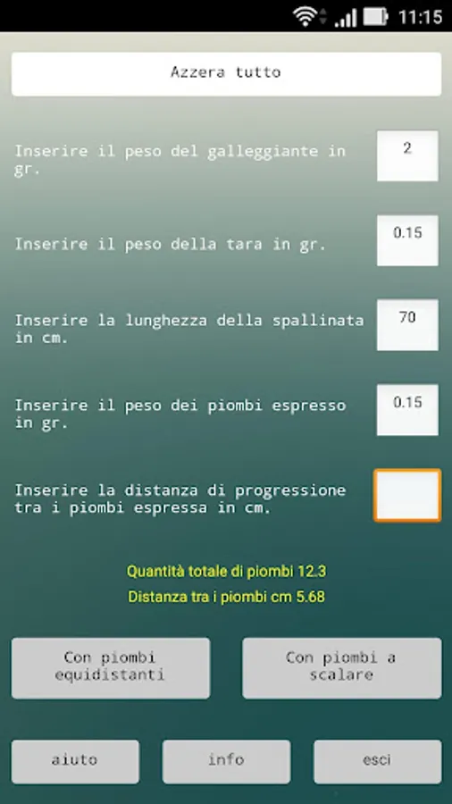 If instead you would like to do a spallinata open-ended, that is, with sinkers progressively more distant from them, you must add an extra parameter which is also expressed in centimeters: the "distance of progression." The program at this point, by clicking on "with lead climbing", will inform us of the number of leads necessary to calibrate the float and the distance to be maintained between the first and second plummet; for each subsequent plummet need to add at this distance centimeters that have been shown in the distance of progression; so it reaches the desired length of spallinata.