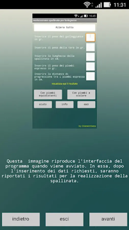 This program has the purpose to simplify the realization of a spallinata for fishing Bolognese, helping the user to draw the necessary parameters in order to calibrate the weight of the sinkers to the weight of the float and the desired length.