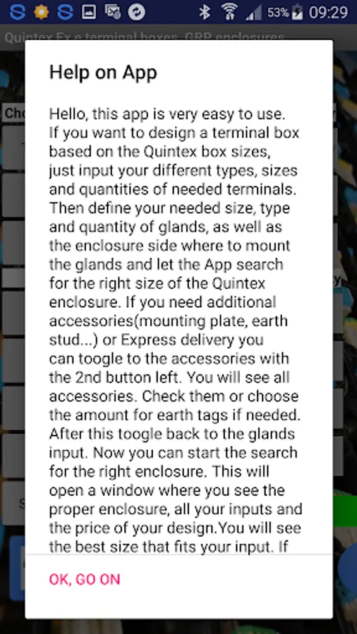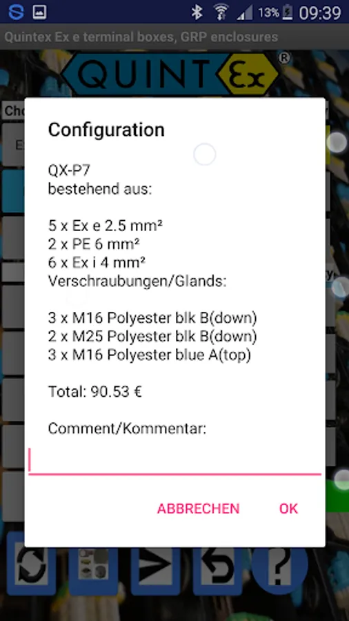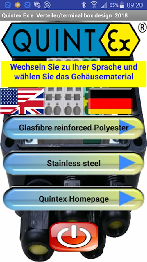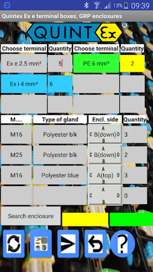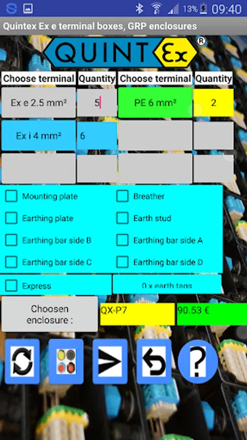 This app is very easy to use. If you want to design a terminal box based on the Quintex box sizes, just input your different types, sizes and quantities of needed terminals. Then define your needed size, type and quantity of glands, as well as the enclosure side where to mount the glands and let the App search for the right size of the Quintex enclosure. If you need additional accessories(mounting plate, earth stud...) or Express delivery you can toogle to the accessories with the 2nd button left. You will see all accessories. Check them or choose the amount for earth tags if needed. After this toogle back to the glands input. Now you can start the search for the right enclosure. This will open a window where you see the proper enclosure, all your inputs and the price of your design.You will see the best size that fits your input. If there is no proper enclosure size for your input you will see a warning. If you want to order you can send this configuration with the 'Send' button. There you can also add some comment (e.g. tags of terminal, bridges for terminals etc..)