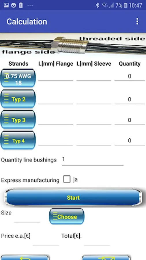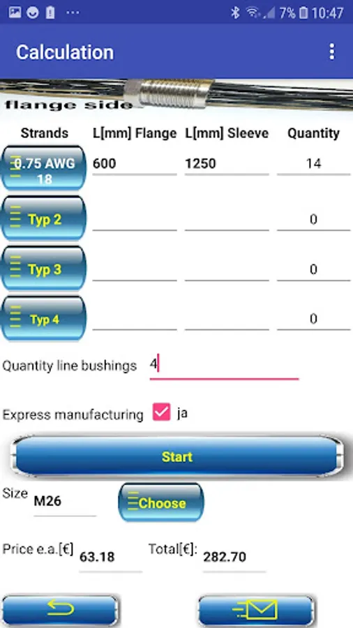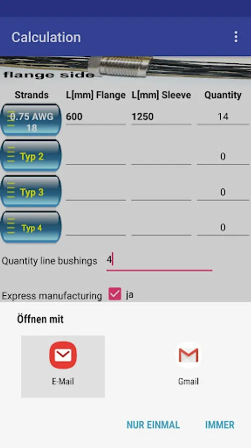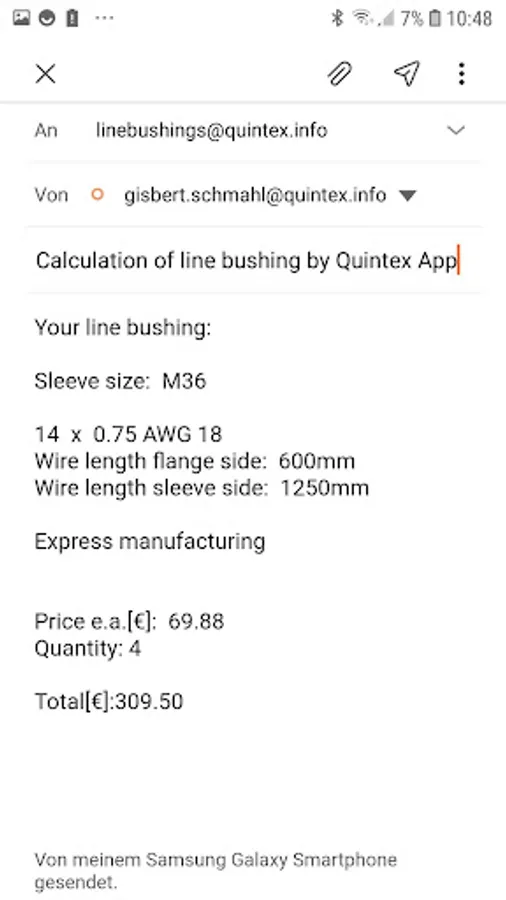 After selecting the diameter, length and number of Radox strands or the specified cables (including glass fiber), you can use this app to calculate the minimum required bushing size. If there are larger diameters available, these can also be selected after the calculation. The list price of such a line bushing is calculated immediately in parallel. It can also be an express order specified (up to 10 LD's). Once the configuration is completed and as requested, the result can be transmitted directly to Quintex from within the app. All data is automatically transferred into the email text. Of course you can complete the text further.