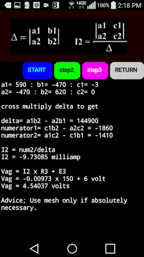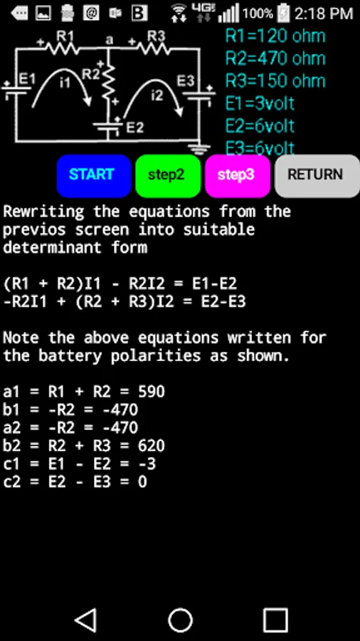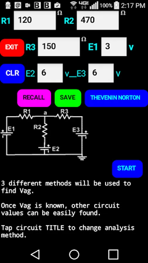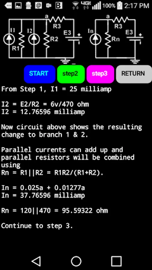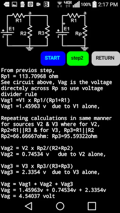 This app solves the same common problem using three different methods of circuit analysis. The circuit is a common one used on multi-input positive gain op amps. Solving it in 3 different ways can give a student some perspective regarding the 3 methods of analysis. All formulas used at every step is detailed and many partial answers are given to guide the student to do some calculations with checks along the way.