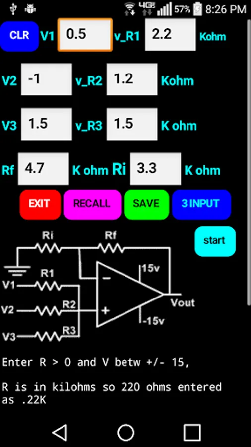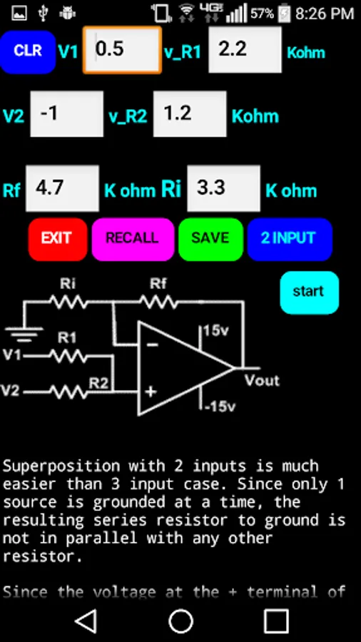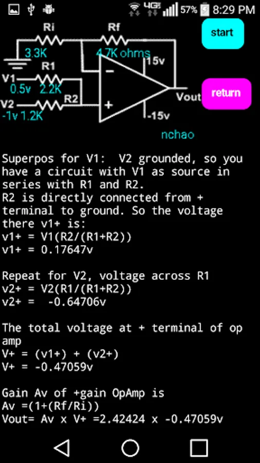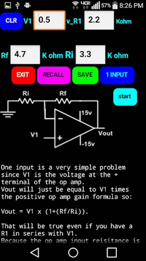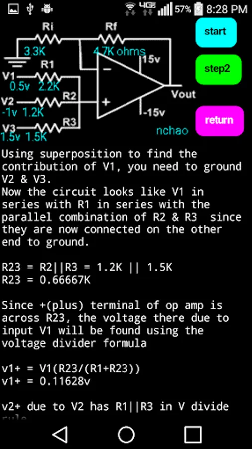 The app leads the student step by step through solutions for 1, 2 and 3 input positive gain operational amplifiers. It is also useful as a homework aid to check your steps and answers.