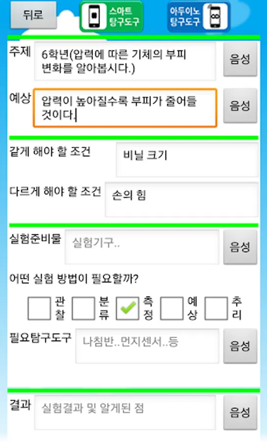 탐구 실험 일지를 앱으로 작성하면서 스마트폰 센서를 활용하여 탐구를 할 수 있다. 또한 블루투스 기능을 통하여 아두이노 센서와 연결하여 탐구를 할 수 있다. 공유기능을 통하여 sns에서 피드백을 받을 수 있다.