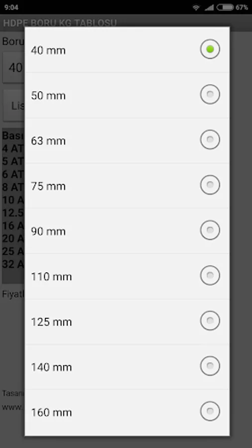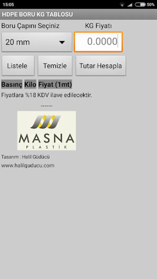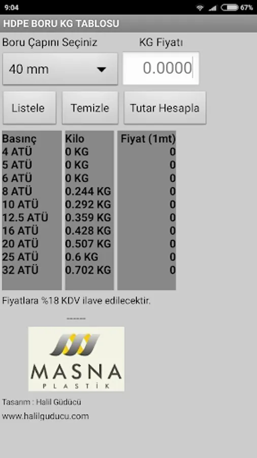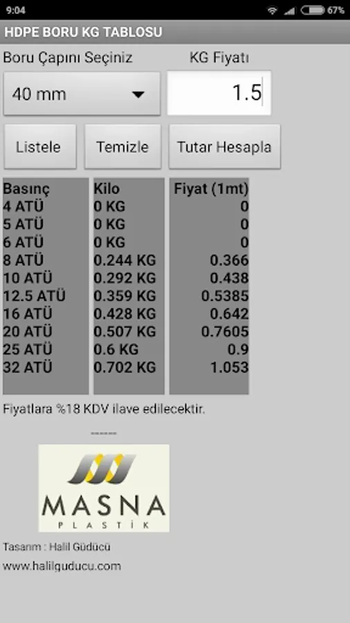 Masna Plastic Co., Ltd. HDPE piping belonging KG and price calculation application, according to the production standards. HDPE Pipe KG