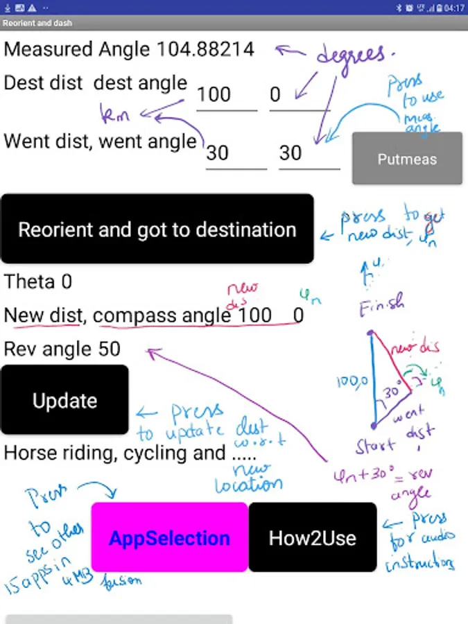 Just press random numbers and calculate in all subapps to see navigation skills and health improve. Its all zero internet except when you request to send email. Press how 2 use to hear audio in every sub app after pressing app selection. Just press violet appSelection for the menu and back button to go to reorient and dash. Everything works even in airplane mode and to send a message in community hero or fun phone or SMS alert you need a connection. Please read book . It takes 50 hrs to learn to use each of the sub app. There are 20 for every field in science and technology. Choose your field and study. You wanna become a DOC and not at Dr. do all 20 for 1000hrs or 1 year. I wrote the smartphone calculator as I call it. Its a Knight's/paramedic's app, others can develop too.