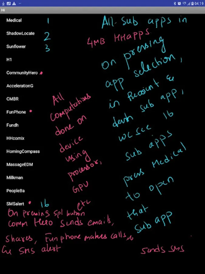 It has some basic navigation apps and some community apps to keep track of favours and a strange memory app. Please click on appsselection in violet where 20 sub apps are in one like non invasive medical level calculator, shadow locate , navigation etc. Please rate if too and give feedback on play store.