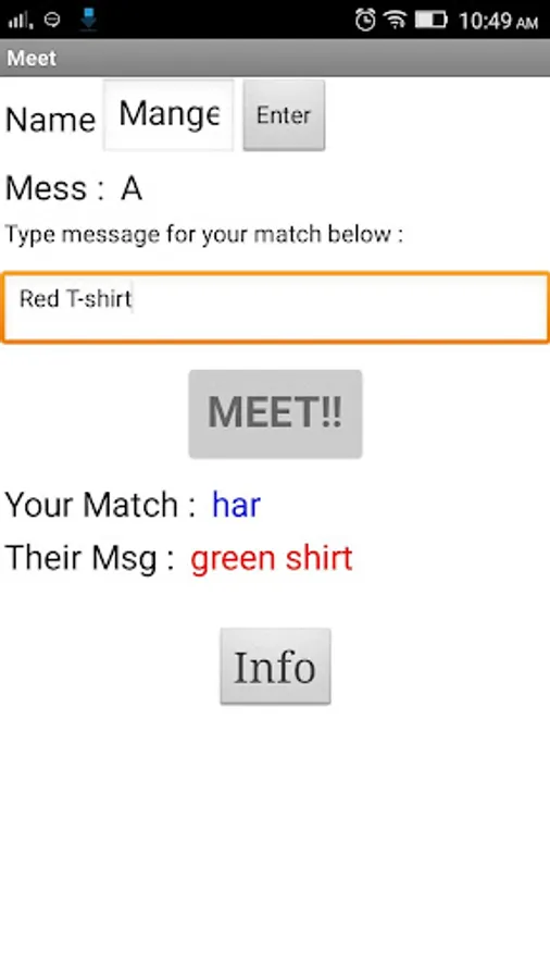 There is now a meet feature. The meet feature allows you to meet a random person in your mess for intellectual company during your meal. 1) Choose your mess in previous Screen. 2) Fill name, press enter. 3) In message, type meal, give identification like shirt color and press Meet! 4) Wait for your match! You cannot try more than once in 2 hours. Wait for 10 secs after 2 hours to let you press meet again. You can't cancel appointment as of now. You can minimize the app while waiting but don't close. If the other person doesn't turn up in the 5 min window, proceed with your meal. Your identity is kept completely private in the app.