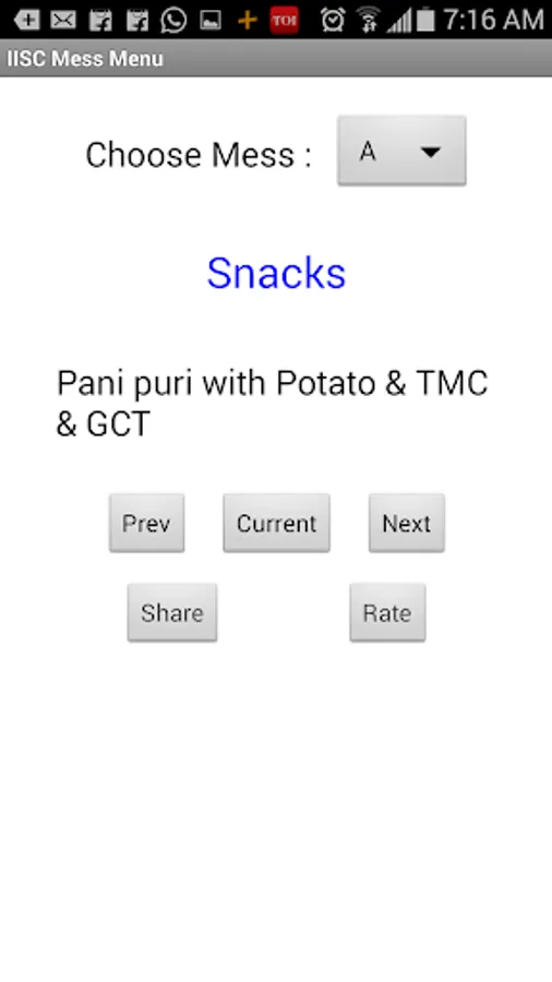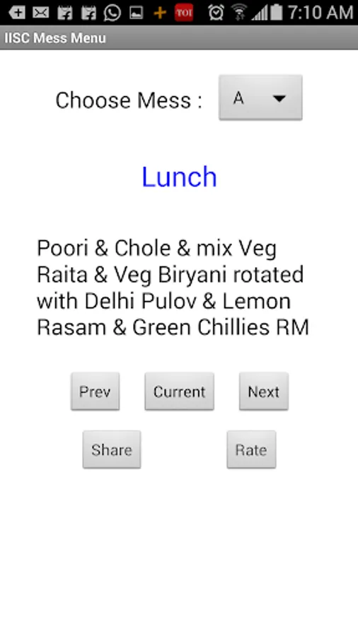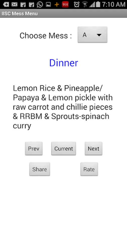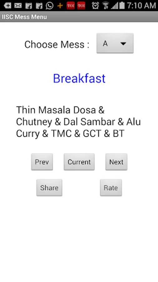 This app is meant to know the mess menu at the Indian Institute of Science in advance. It allows you to plan ahead if you want to bring a guest, sign off, etc. When you open the app, it shows the next upcoming meal. This changes after the specified mess timing (when you open again). You can also manually check the other meals for any day of the week. You can set your mess and this will be remembered next time.