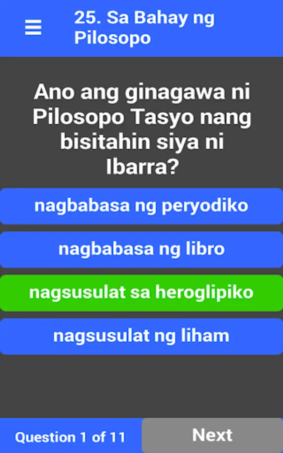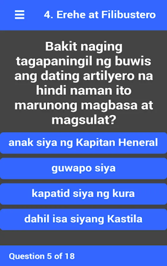 This quiz game is a practical and easy way to remember details about Jose Rizal's famous book. No more flash cards. Study anytime, anywhere.