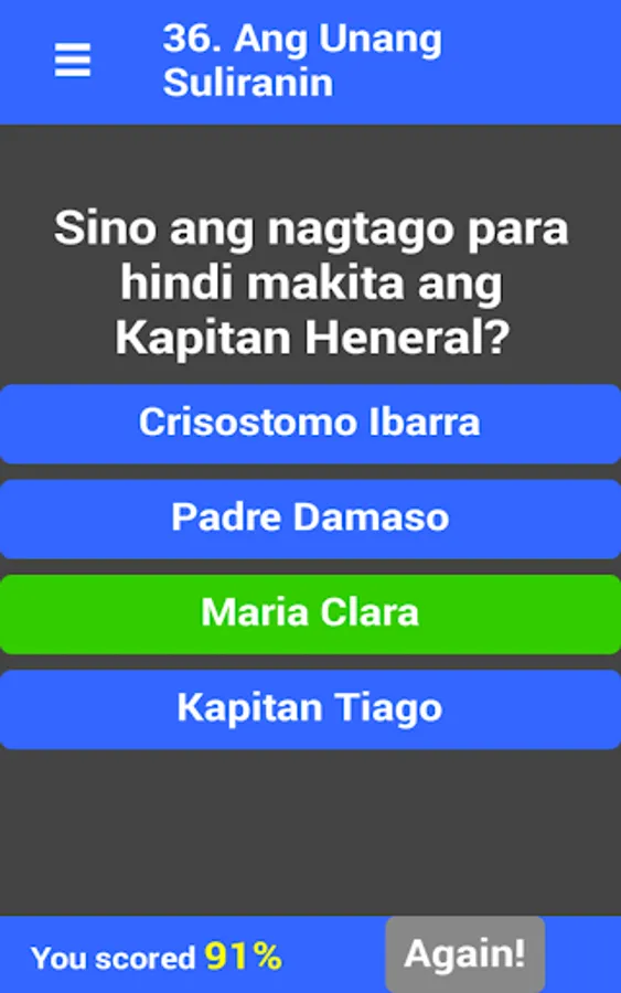 This quiz game is a practical and easy way to remember details about Jose Rizal's famous book. No more flash cards. Study anytime, anywhere.