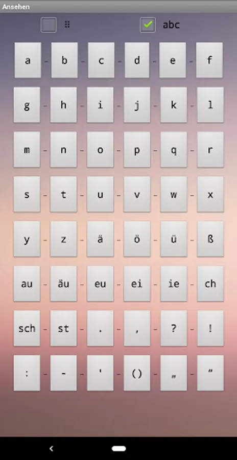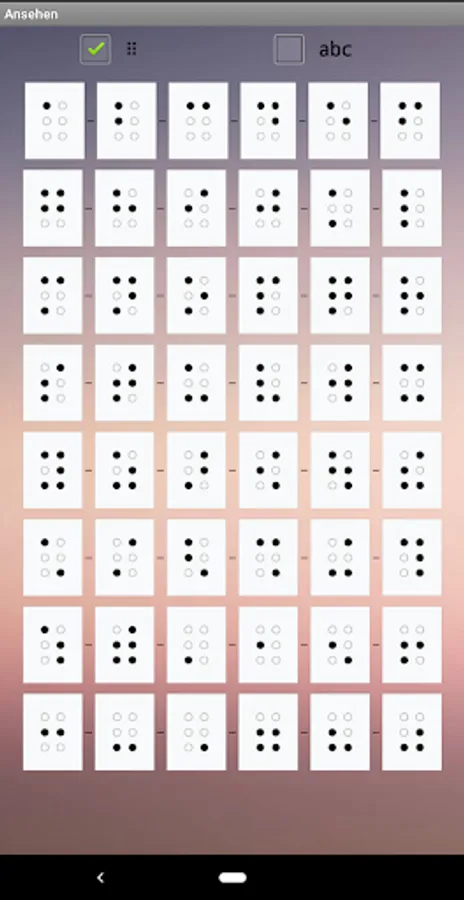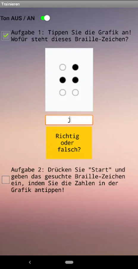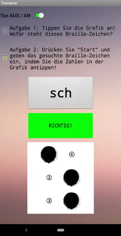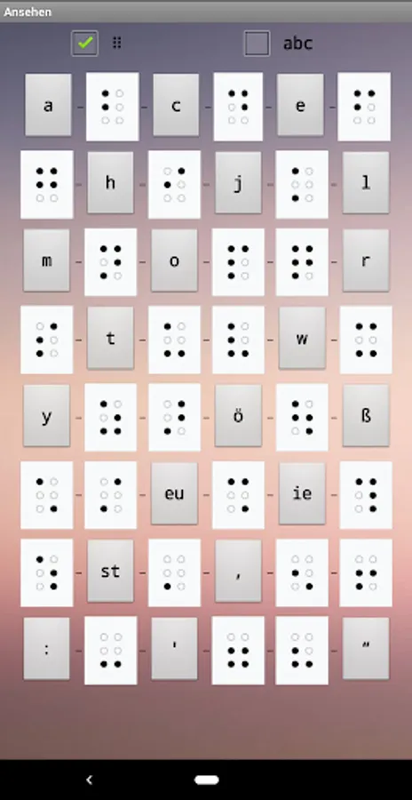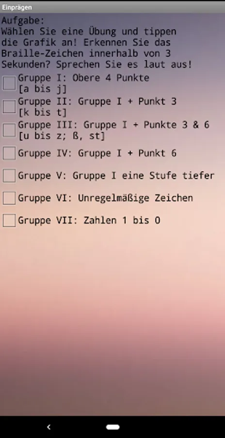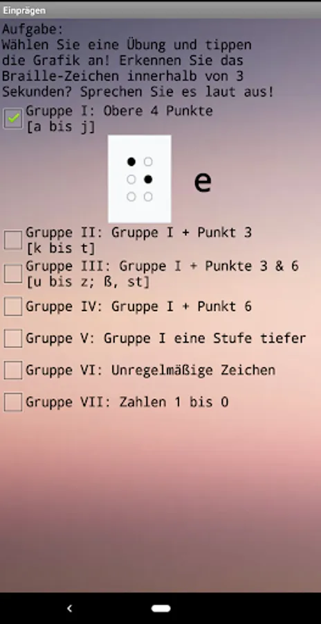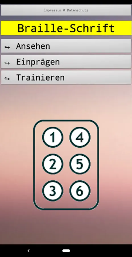 The app contains an overview of the 48 most important characters in German Braille, a page for systematic memorization of the same and a page for more intensive training with a display of the number of points achieved. Handling is mostly self-explanatory.