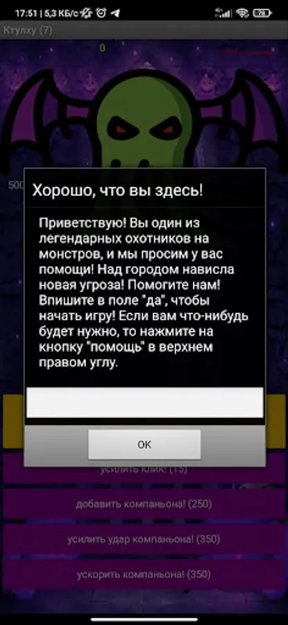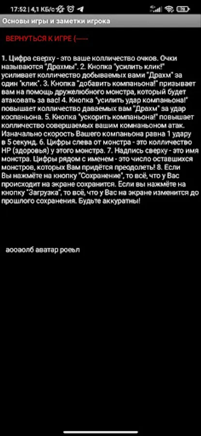 1. The number on top is your number of points. The glasses are called "Drachmas". 2. Button "strengthen click!" enhances the amount of "Drachmas" you get in one "click". 3. Button "add companion!" summons a friendly monster to help you, who will attack for you! 4. Button "strengthen the blow of a companion!" increases the amount of "Drachmas" given to you for hitting a companion. 5. Button "speed up companion!" increases the number of attacks made by your companion. Initially, your companion's speed is 1 hit every 5 seconds. 6. The numbers to the left of the monster are the amount of HP (health) that monster has. 7. The inscription on top is the name of the monster. The numbers next to the name are the number of remaining monsters that you will have to overcome! 8. If you click on the "Save" button, then everything that is happening on the screen will be saved. If you click on the "Load" button, then everything that you have on the screen will change to the last save. Be careful!