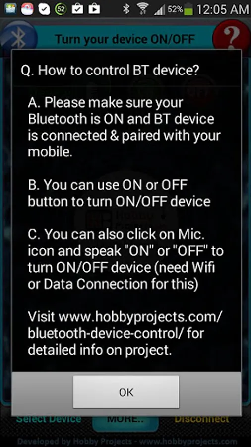 3. When you press OFF button it sends the data "a" to Bluetooth Module connected with a circuit. Micro-controller turns OFF the relay when it detects "a"