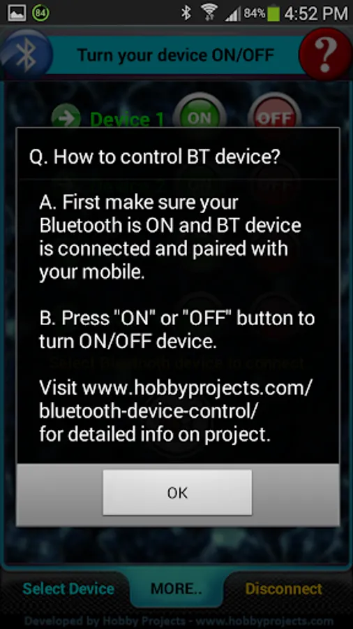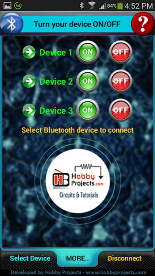 3. When you press OFF button for Device 1 it sends the data "a" to Bluetooth Module connected with a circuit. Microcontroller turns OFF the Device 1 relay when it detects "a".