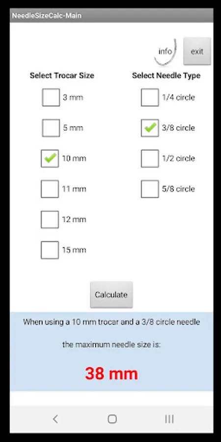 The user has the ability to select six different trocar sizes (3, 5, 10, 11, 12 and 15mm) and four different types of curved needles. The final result is the maximum length of a curved needle that can fit into a specific trocar during laparoscopic surgery.