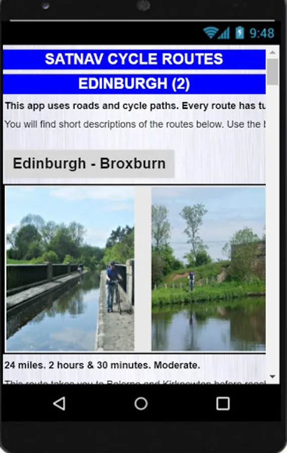 Satnav Cycle Routes around Edinburgh using cycle paths and roads. Every route has turn-by-turn navigation with voice instruction. Enjoy the benefits of cycling a whole route by following Sat Nav instructions without having to buy an expensive Sat Nav. Just download the app to your device.