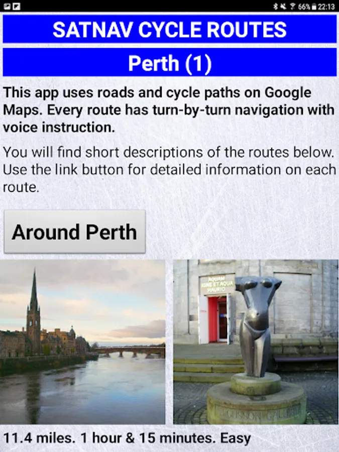 Three Satnav Cycle Routes around Perth using cycle paths and roads. Every route has turn-by-turn navigation with voice instruction. Enjoy the benefits of cycling a whole route by following Sat Nav instructions without having to buy an expensive Sat Nav. Just download the app to your device.