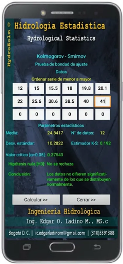 The Kolmogorov-Smirnov test for a sample is a "goodness-of-fit" procedure, which makes it possible to measure the degree of agreement between the distribution of a data set and a specific theoretical distribution. The application performs the goodness of fit test for 18 data, which must be ordered from smallest to largest. The processing time of the 18 data is approximately 28 seconds because it performs approximately 11255 iterations associated with the calculation of the normal probability for each data.