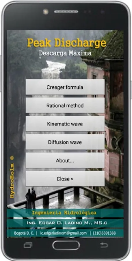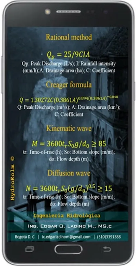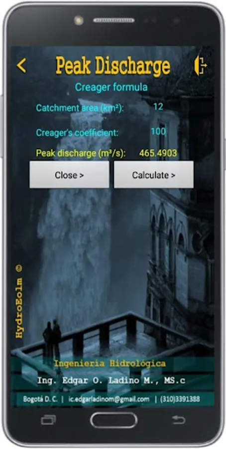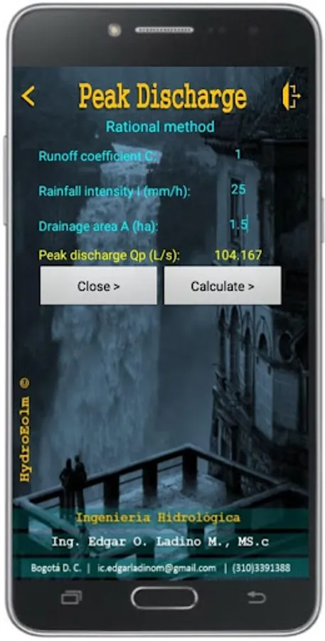 The Rational Method expresses a relationship between rainfall intensity and catchment area as independent variables and the peak flood discharge resulting from the rainfall as the dependent variable, this App calculate the peak discharge by Creager formula, Rational method, Kinematic wave and Diffusion wave.