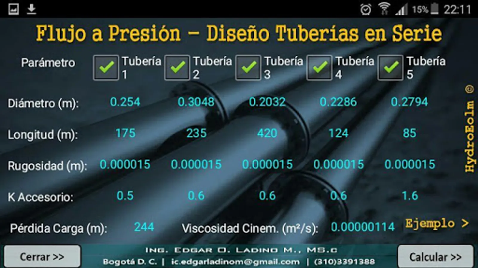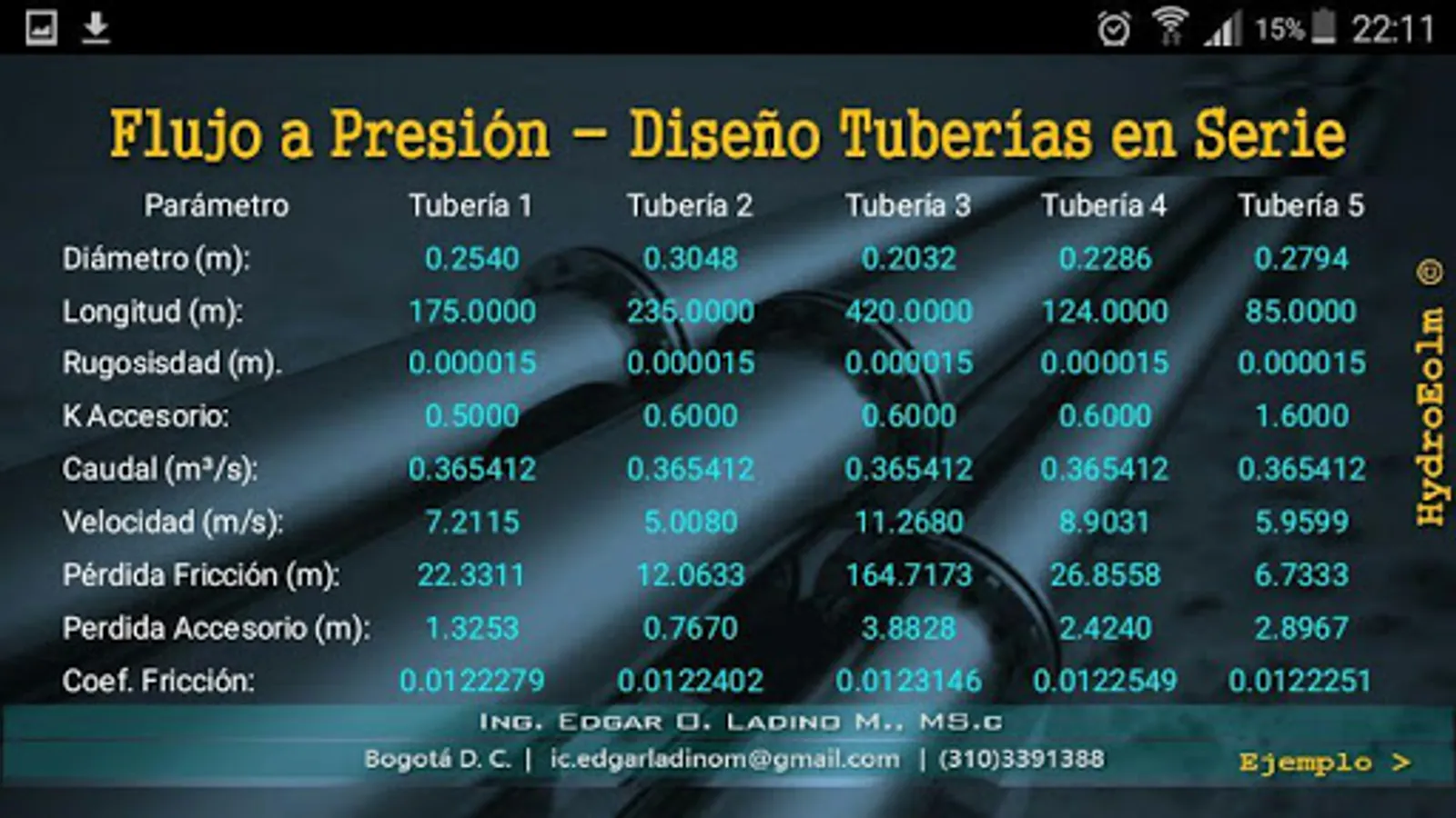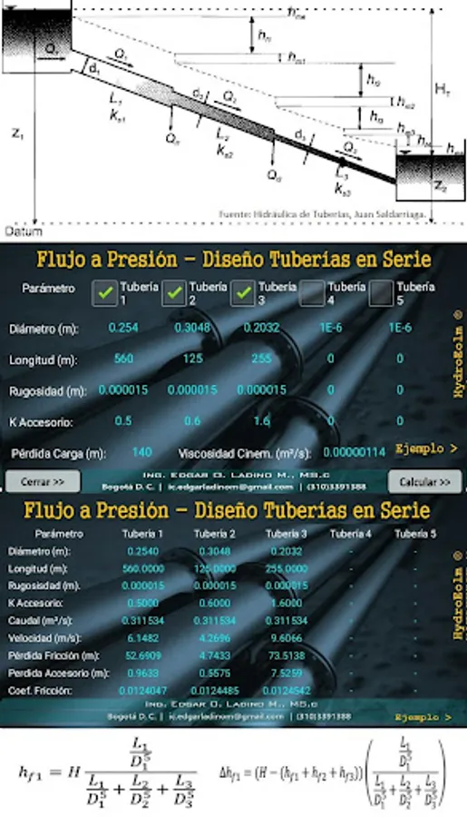 Serial Piping System: Calculation of flow, velocity, friction losses, accessory losses and friction coefficient, from Darcy & Weisbach and Colebrook & White.