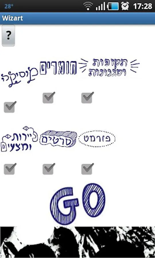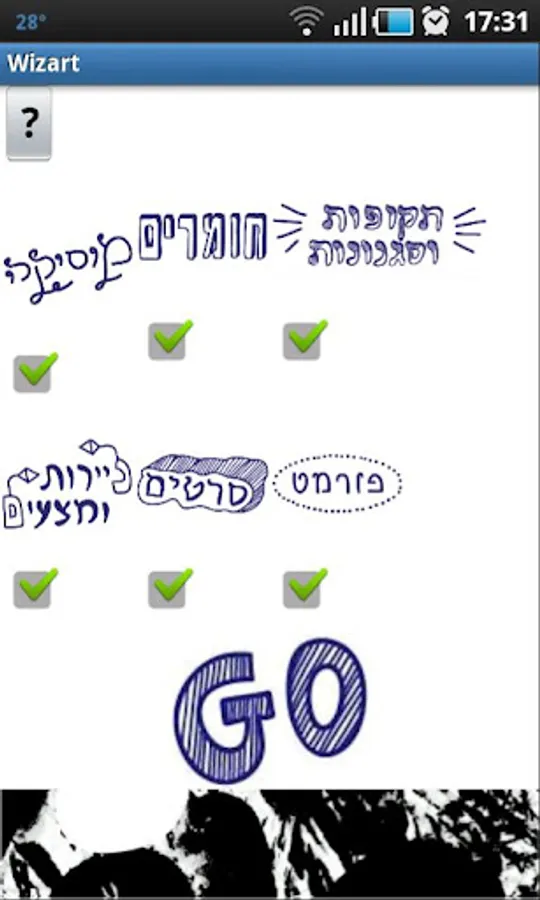 Use of this application is intuitive and requires only little explanation. The output result is a short text message that when displayed will inspire you as to the general concept of your creation. The result is not a graphical element. Once you click on “GO” you will not be able to select other categories. We suggest not to select to many categories – as this will limit the creativity that is so important to you and us. This app provides a solution which will become your inspiration. We do not aim to provide you with crisp answers but rather provide some guidance in an ocean of white canvas. Using the app does not require Internet connection. Special thanks go to: Osher Oren, Tamir Avraham, Iris Ben-Aharon, Doron Yaacov and Anat Shwartz.