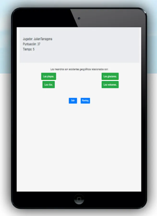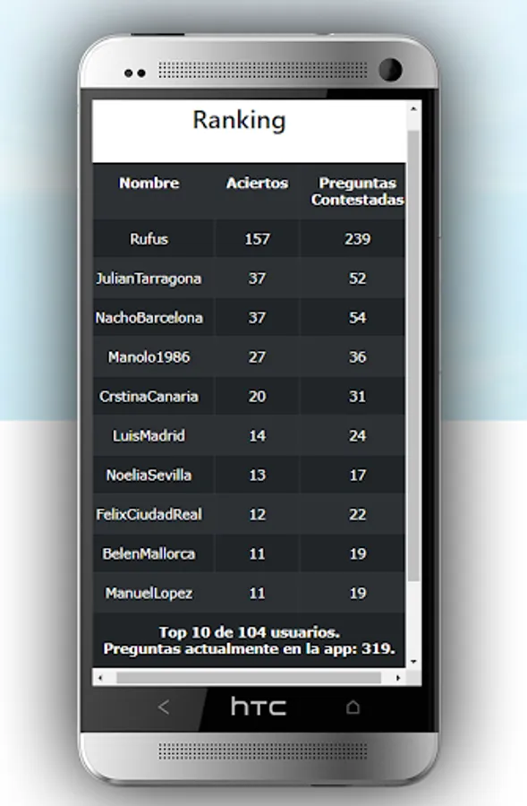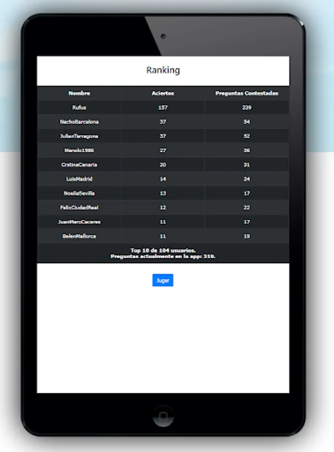 The objective of the game is to answer general culture questions in a few seconds and to be able to see if you are in the top 10 comparing yourself with the rest of the players.