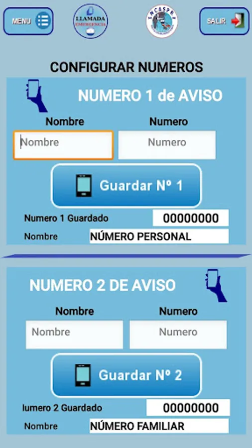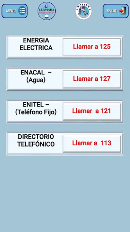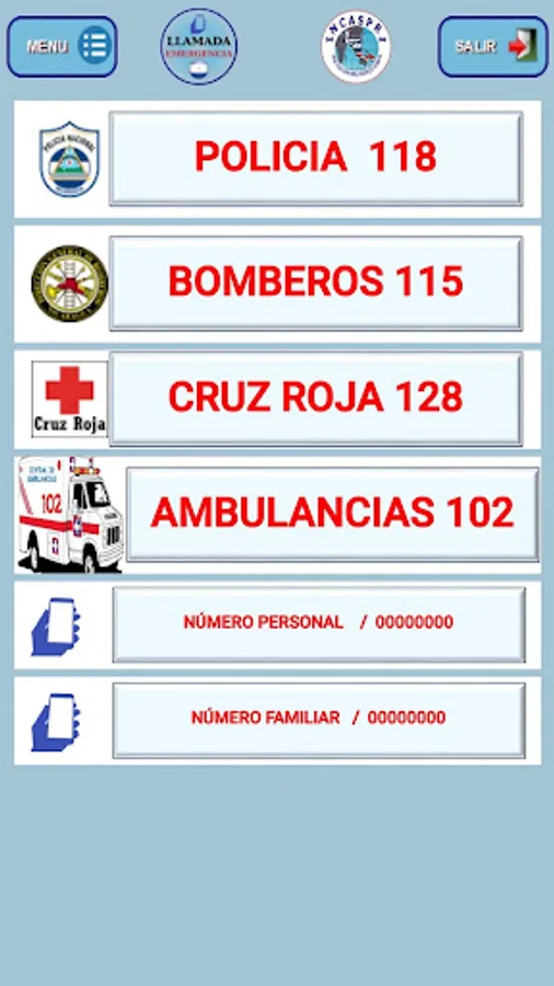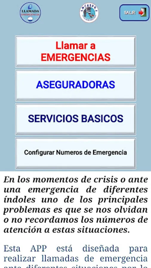 This APP is designed to make emergency calls in different situations, so there are the numbers of the POLICE, FIREFIGHTERS, RED CROSS and AMBULANCES, as well as two personal numbers that can be pre-programmed.
