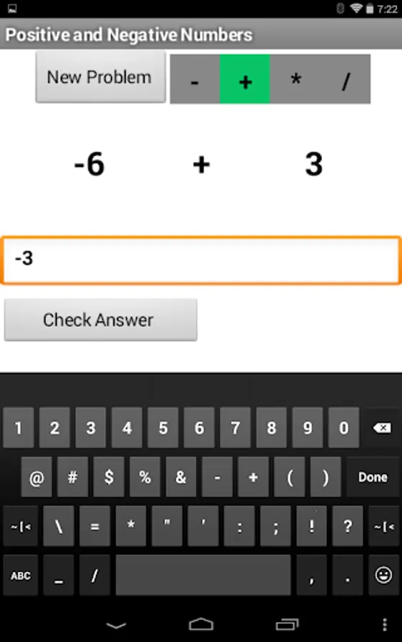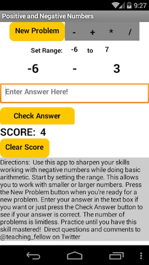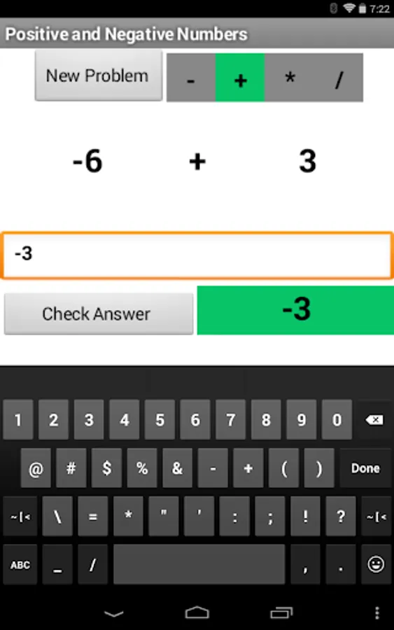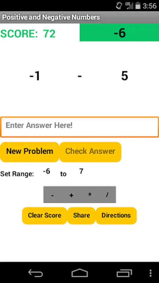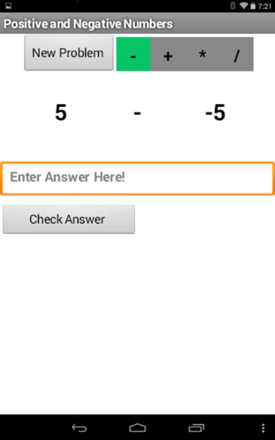 Practica el sumar, restar, multiplicar, y dividir con numeros negativos. Verificar tu respuesta inmediatamente. Cambia la operacion. Escoja entre sumar, restar, multiplicar, y dividir. Con el boton New Problem sigues practicando hasta cuando quieras.