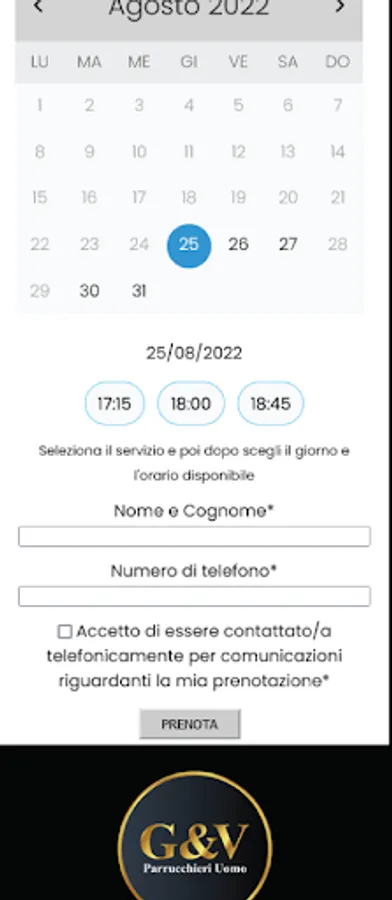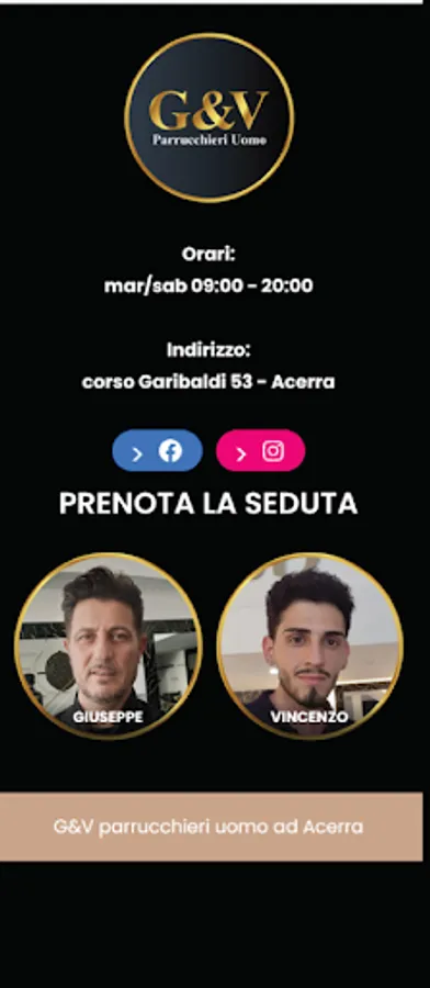 The G&V men's hairdressers application allows you to book a session at the salon located in Acerra in the province of Naples to take advantage of the services provided by Giuseppe and Vincenzo.