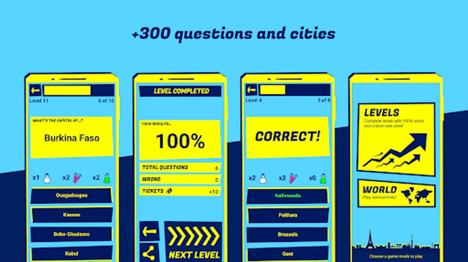 With our app đWorld Capitals: City Quizđ you will improve your geography knowledge while having fun and spending a good time!