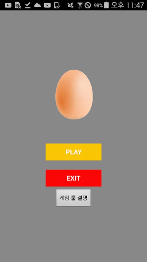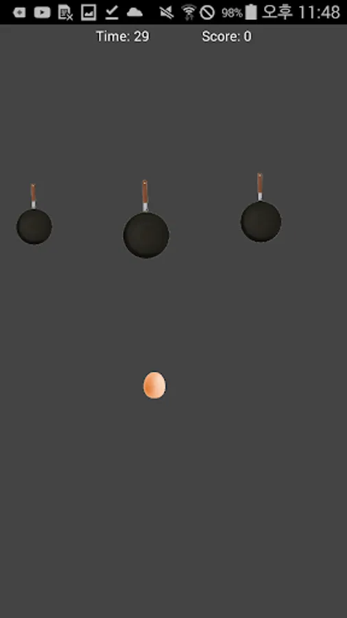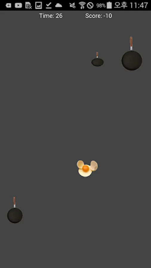 제한시간 30초내에 높은 점수를 얻는 것이 게임의 룰입니다. 프라이팬에 닿을 경우 계란이 깨지고 진동이 울립니다. 프라이팬에 부딪힐 경우 점수가 10점씩 줄어듭니다. 프라이팬을 피할 경우 점수가 5점씩 증가합니다. 가볍게 쉬는시간에 할일이 없을 경우 하기에 좋은 게임입니다.