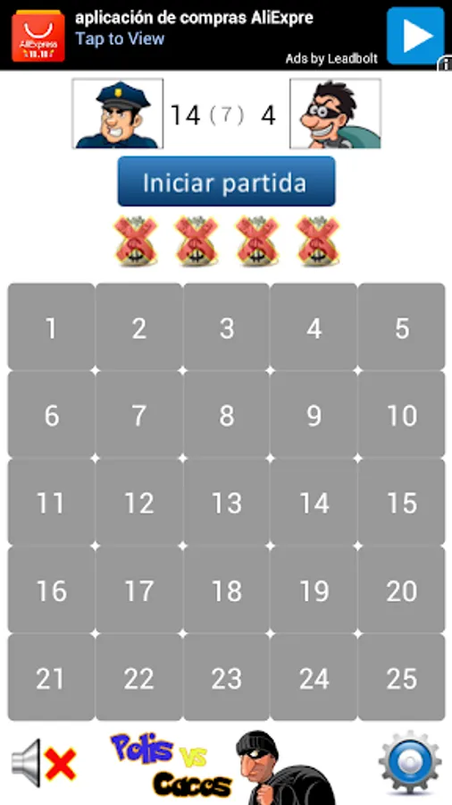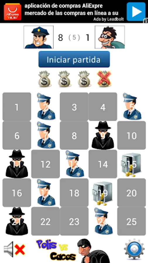 Polis VS Cacos is a strategy game. On the board of 25 squares there are four thieves who have robbed several banks taking the bags of money you need to recover. There are also 7 safes that should prevent stealing and all this before you run out of there in 14 police commissioner.