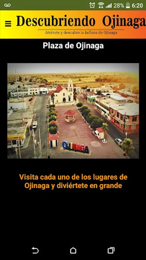 Discovering Ojinaga is an application developed with the aim of promoting tourism and helping foreign people who go to the city of Ojinaga. In the application you will find photos and the location of the 6 most visited tourist places in Ojinaga.