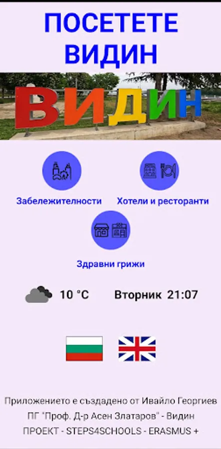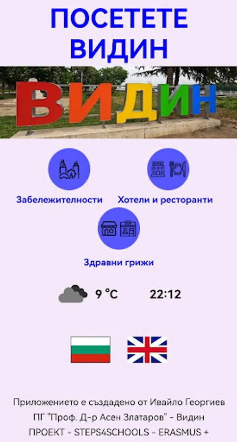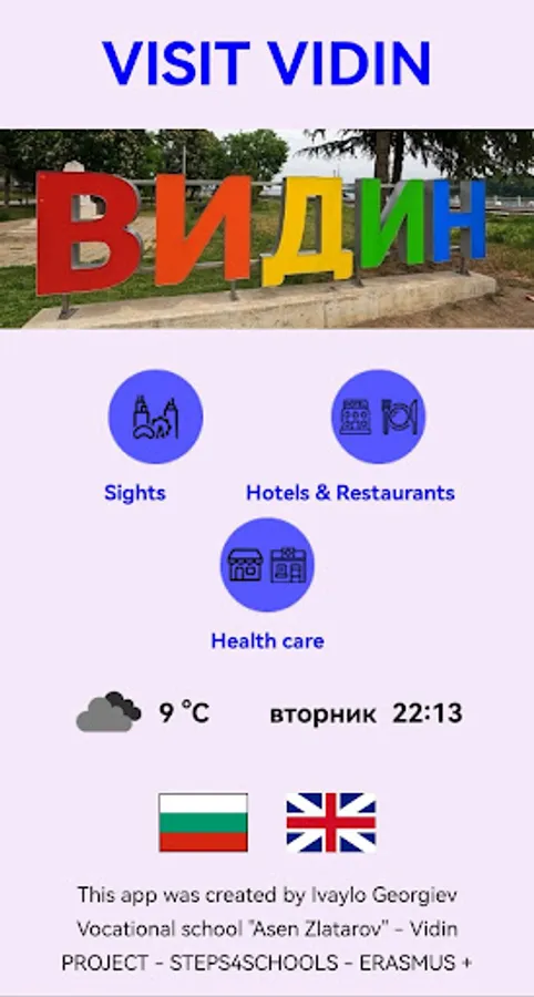 A convenient application that gives information about the main sights in Vidin. Enjoy a pleasant walk with the electronic guide. Learn more about the city's history. Turn on the location and it will help you find all the landmarks.