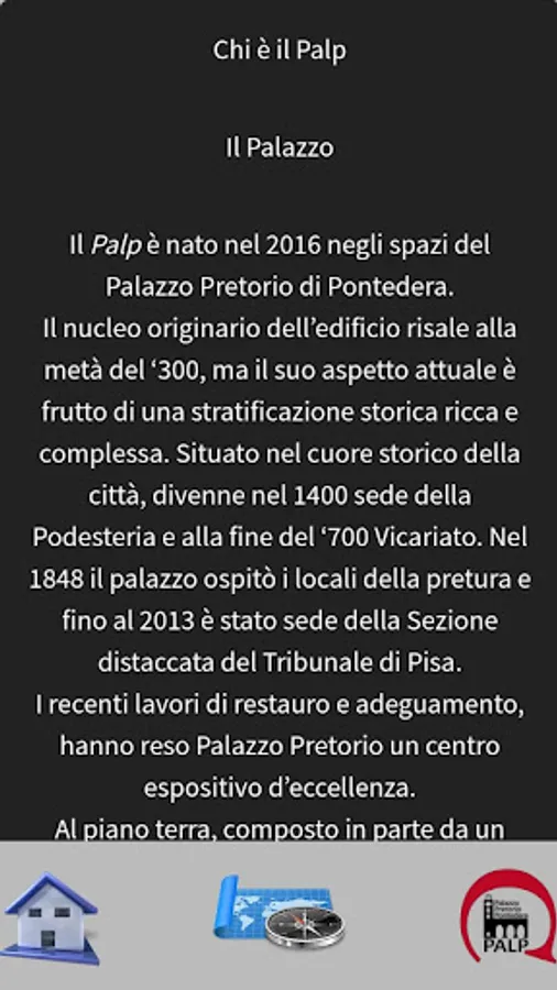 This App was created to allow visitors to orient themselves in the Palp museum of Pontedera also with 360 ° photos of the different rooms.